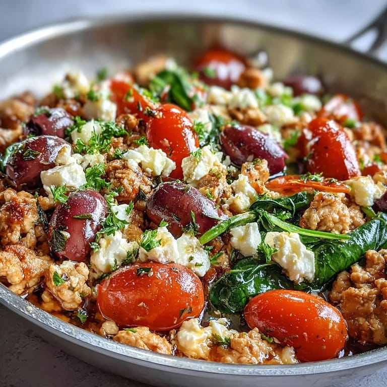 Save The smell of oregano and olive oil sizzling together always pulls me straight into a memory of my cousin's tiny Athens kitchen, where everything was cooked in one pan and tasted like sunshine. I started making this ground chicken skillet on a Wednesday night when I had fifteen minutes and a fridge full of random ingredients. The briny olives and creamy feta turned simple chicken into something that felt like a vacation. Now it's my default when I want flavor without the fuss. One skillet, no regrets.