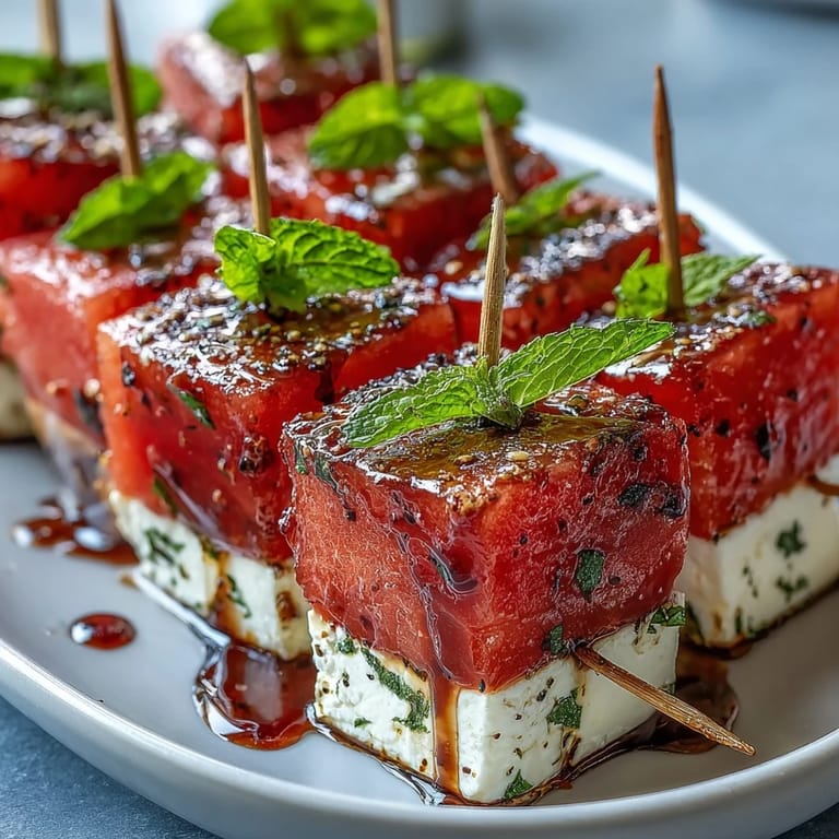 Save The very first time I made these watermelon feta mint skewers was in the thick of July, music drifting through the kitchen window and sunlight pouring onto the countertop. I remember the sharp scent of fresh mint as I plucked the leaves from their stems, shockingly cool against my fingers, and the satisfying thunk of the knife slicing through crisp watermelon. My cousin dropped by unannounced, and we ended up laughing together as we assembled the skewers, juice dripping down our wrists. There was a sense of playful improvisation, especially when we argued over whether to drizzle the balsamic glaze or keep it simple. Ever since that afternoon, these skewers have signaled the unofficial start to every backyard gathering.